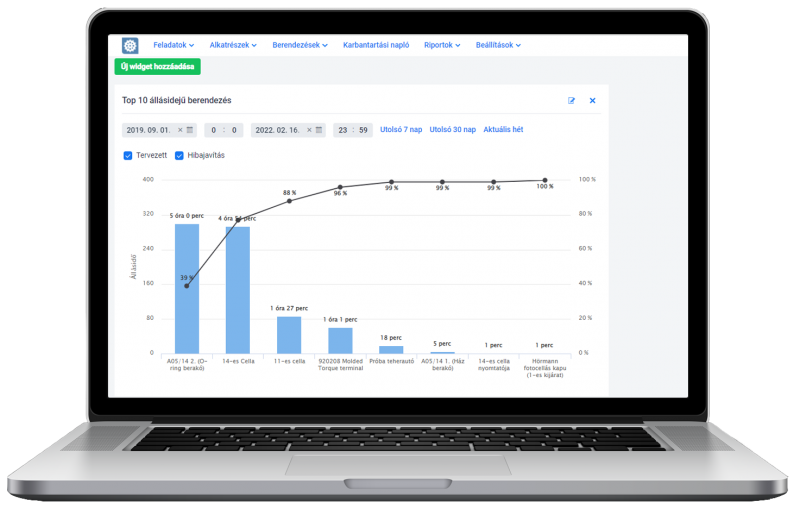 A karbantartások hatékonysága számos riporttal követhető nyomon. Tetszőleges időszakra és lokáció szintekre beállítható grafikonokon láthatók az MTBF és MTTR mutatók, állásidők alakulása és aránya, ráfordítások alakulása. A kezdőképernyőn gyorsan áttekinthető az aktuális időszak eredményessége és a megelőző időszakhoz képest történt javulás vagy romlás.