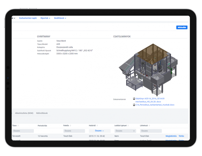 A rendszerben kezelhetők a berendezések technikai, költség- és garanciális jellegű adatai, láthatók a rájuk kiírt munkafeladatok és a beépült alkatrészek, életútjuk naplószerűen visszakövethető. Gépkönyvek és műveleti utasítások könnyedén csatolhatók.